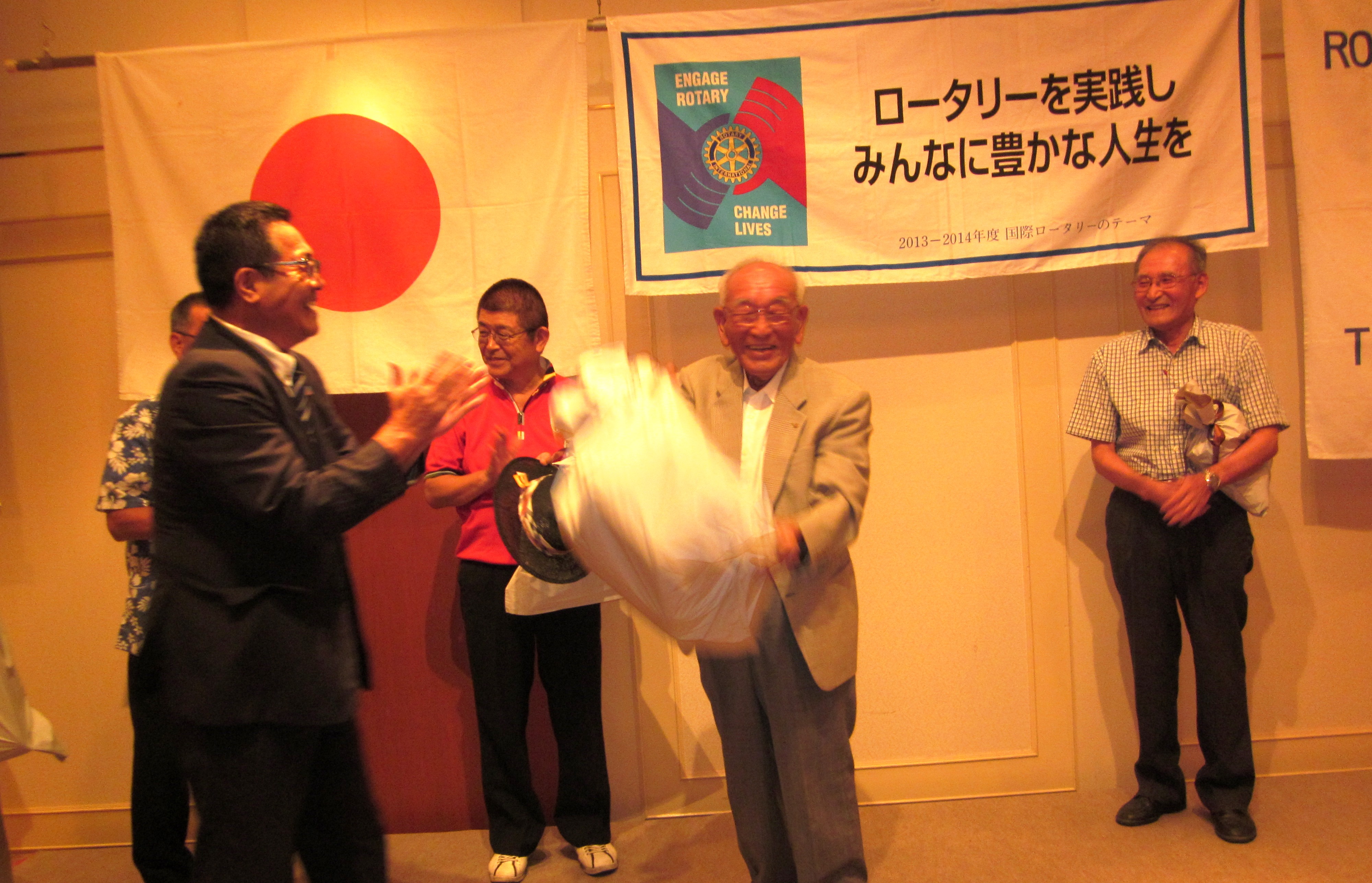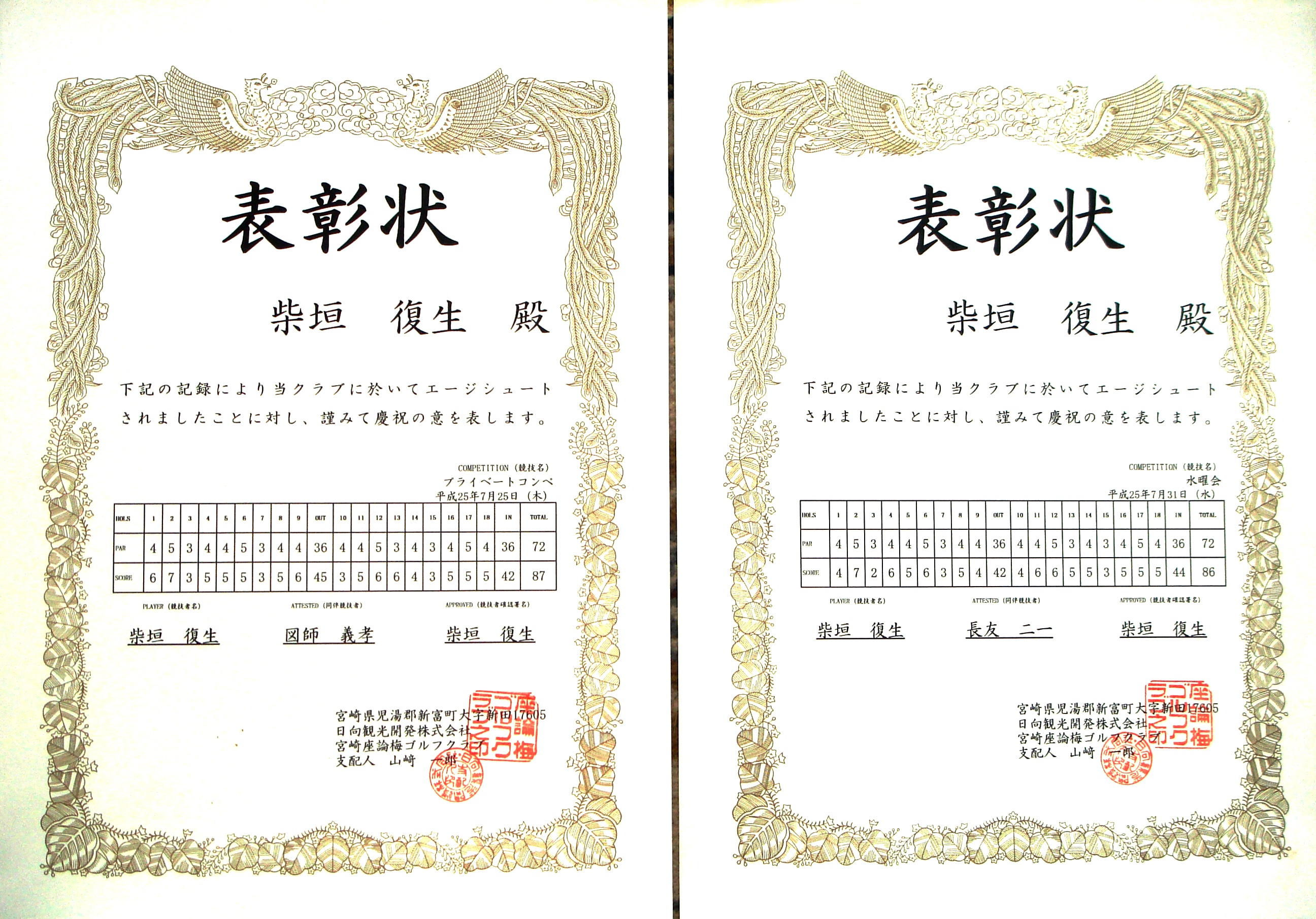 去る7月25日(木)に開催された高鍋RC直前会長・幹事の慰労ゴルフ大会(座論梅GC)において、優勝とともに4回目のエージシュートを実現し、当日の夜間例会の席上で、皆様から盛大なる祝福と記念品もいただき、誠にありがとうございました。因みに3回目のエージシュートは、4年前の5月に米沢RCを訪問の際、現地の(始めての)コースで実現し、この時も皆様から盛大な祝福と記念品をいただき、生涯の良い想い出になりました。