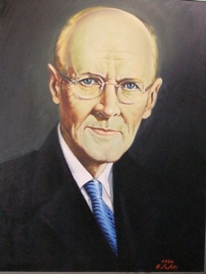 会議室には、業務の都合で集会に間に合う様に駆け付けた会員もおられかなりの参加者数であった。最初は明日27日がポール・ハリスの命日に当たることから、正面檀上に佐々木九州男君作成の大きな肖像画を置き、それに向かって全員起立して黙とうを行うことから始まった。